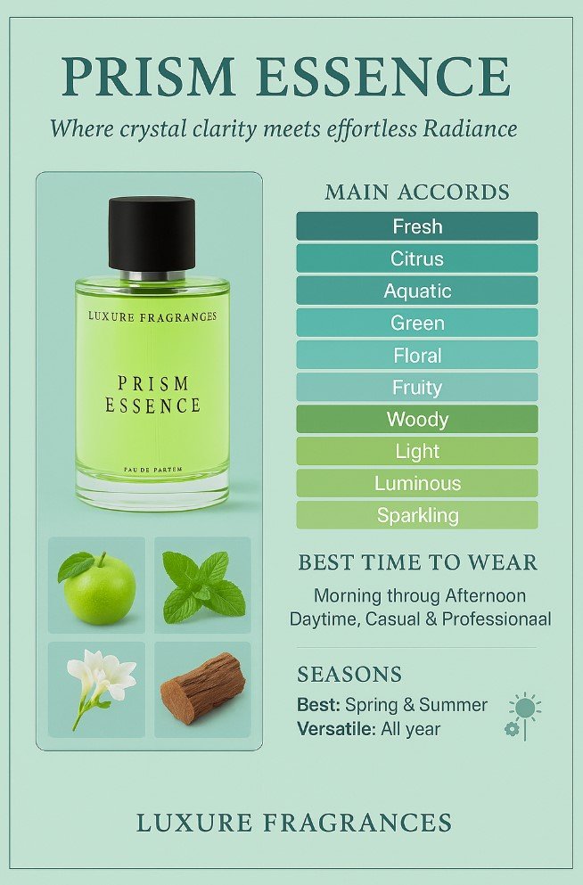 A luminous aromatic aquatic fragrance featuring green apple, bergamot, mint, and lily of the valley. A crystalline fresh scent that captures pure light and radiance. Perfect for those who embrace everyday brilliance.